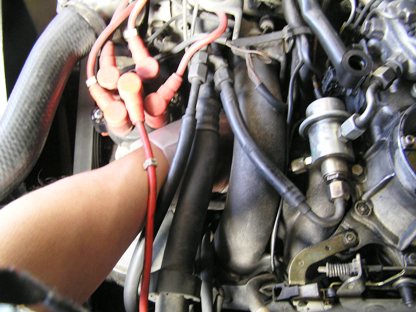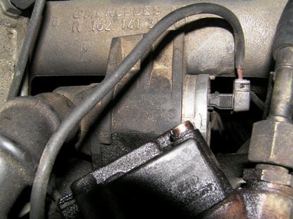 | 102エンジンのアイドルエアーバルブはゴムに通されていて、インテークマニーホールド2本に挟まれて固定されています。ゴムからバルブを先に引き出すスペースもありません。 | ![]() |