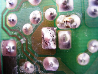 | Edyeの秘密部屋で相談すると多くの方からご助言を頂き、オーバーボルテージリレーが原因ではないかと。 リレーを旧タイプと交換するとともに、「対策品」を開腹してみました。 ごらんのような亀裂が発見されました。 |