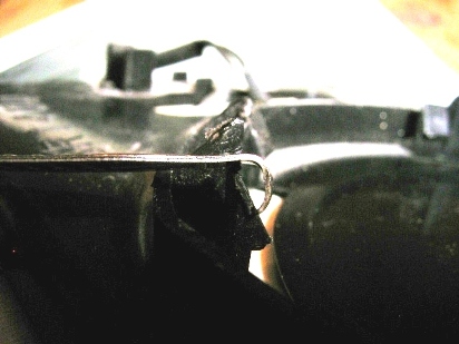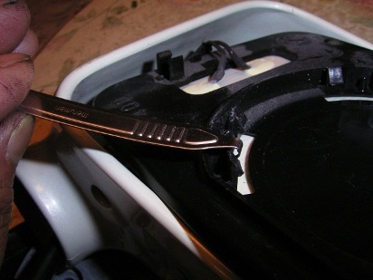 | ミラーの隙間からSST(落ちてる金具を折り曲げて作成)を差し込んでツメを広げます。 | ![]() |