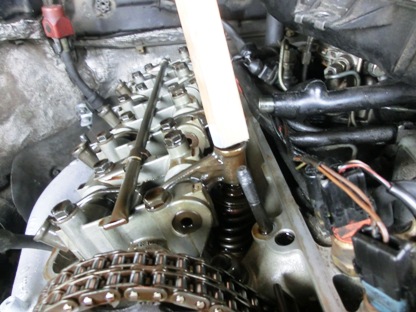 | 私の車、4気筒ですのでロッカーアームが8個 上部を木で押さえてみても、違和感はありません。 正常な状態がどうなのかが分かっていませんのでなんの役にも立ちませんけど。 |